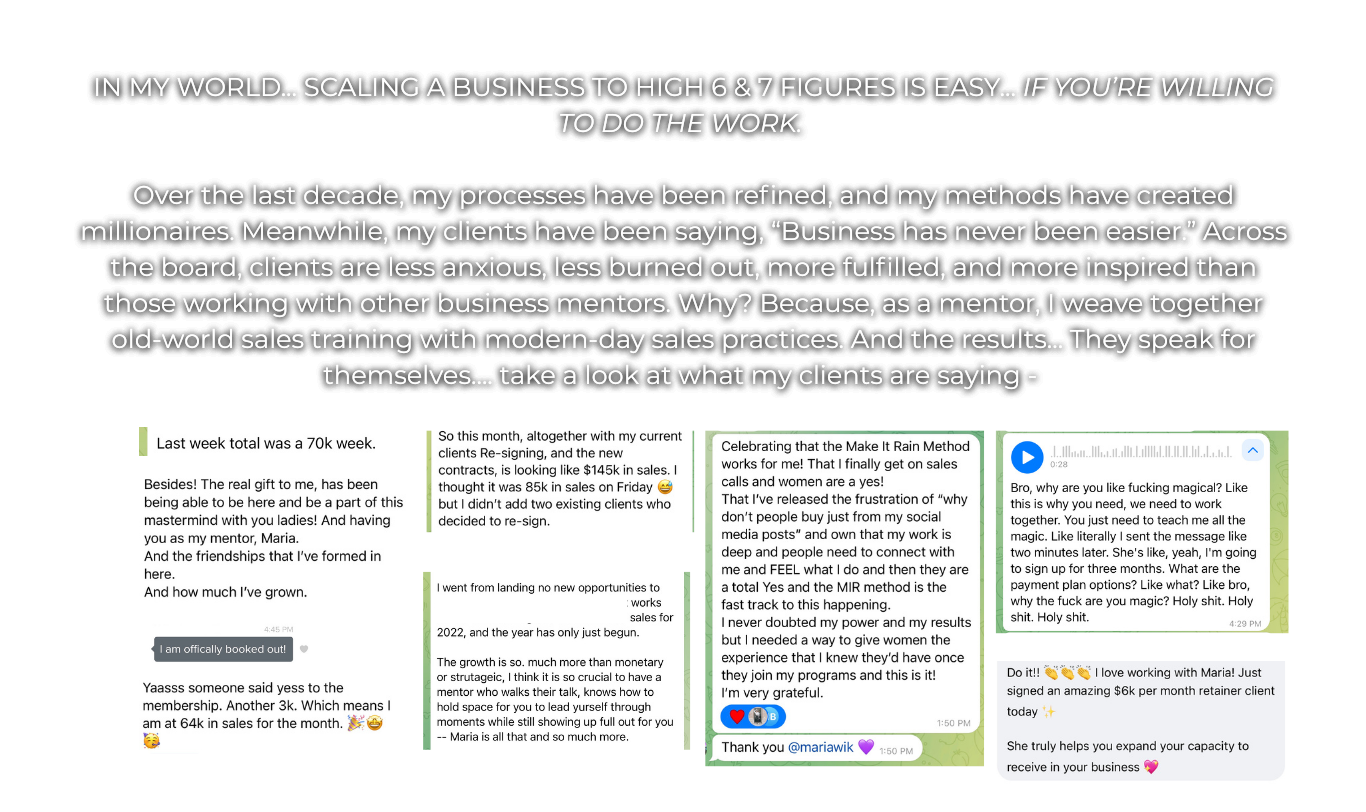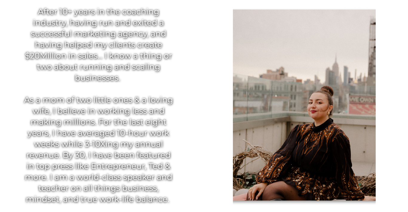 Now it's your turn... I want to teach you exactly how I have helped my clients - and myself - make millions in online coaching while working 10-15 hour work weeks, bringing in high profits, and feeling GOOD.